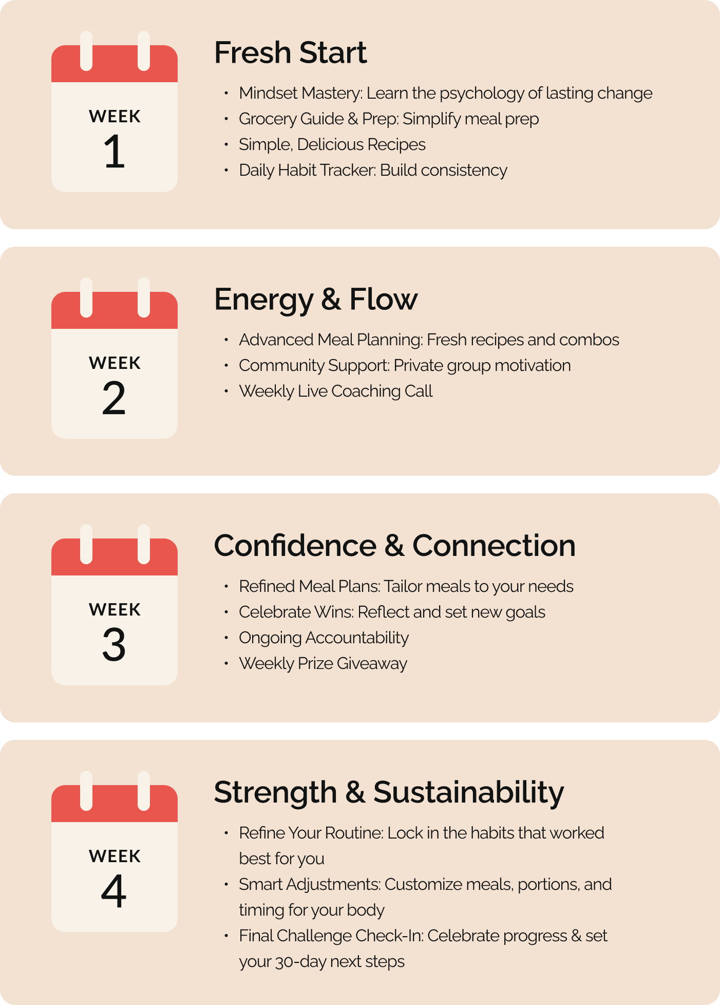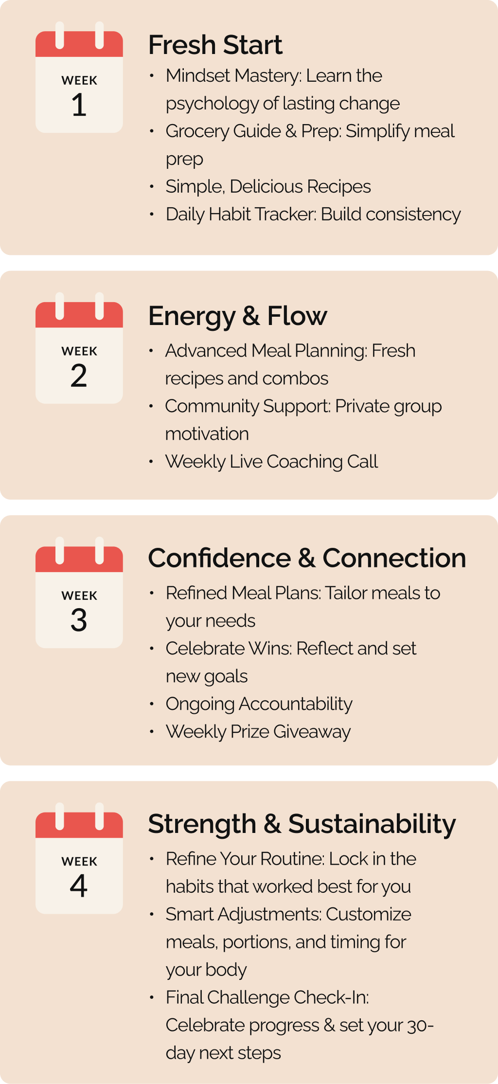 As soon as you sign up, you’ll get instant access to your challenge guide, recipes, and pre-challenge resources. We’ll walk you through exactly how to get set up, and your 21-day journey kicks off right away.